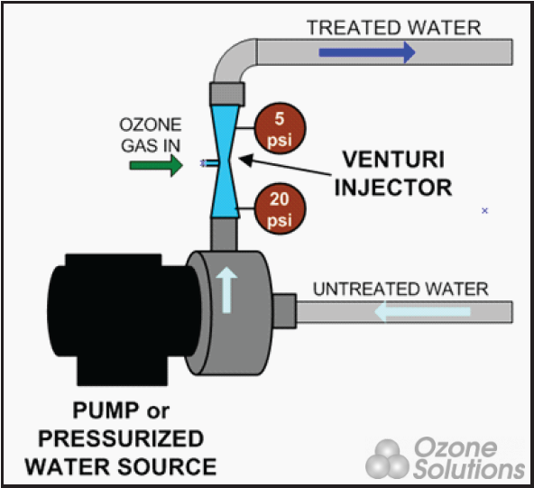 انژکتور Venturi یک روش بسیار رایج تزریق ازن در دستگاه ازن ژنراتور می باشد و کاربرد صنعتی دارد. انژکتور Venturi روشی کامل برای تزریق ازن است و میزان زیادی گاز ازن در آب حل می شود. انژکتور Venturi نیاز به اختلاف فشار در دستگاه دارد تا گاز اوزون را به مخزن حاوی آب تزریق کند. وقتی سیال در لوله ونتوری جریان‌ می‌یآبد، انبساط و انقباض سیال در طول لوله باعث تغییر فشار می‌گردد. این انژکتورها باعث ایجاد حبآب های بسیار کوچک برای انتقال جرم بیشتری می شود. استفاده از انژکتور ventui به تنهایی می تواند نرخ انتقال جرم 90٪ را به دست آورد.